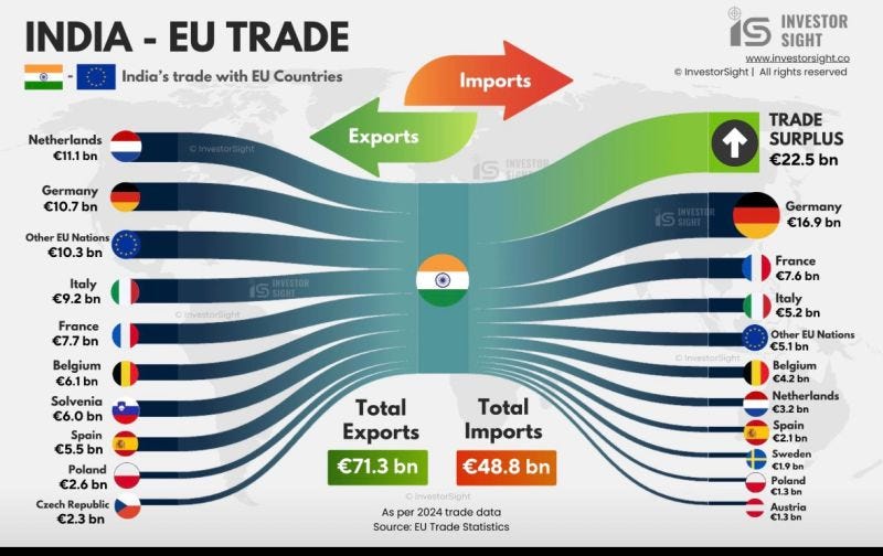 India’s strategic value to Europe is underscored by size: together the EU and India represent about 2 billion consumers and roughly 25 percent of global GDP. Bilateral goods trade already exceeded €180 billion in 2024, and analysts project EU goods exports to India could nearly double by 2032 as tariff barriers come down and regulatory procedures are streamlined and relaxed.
