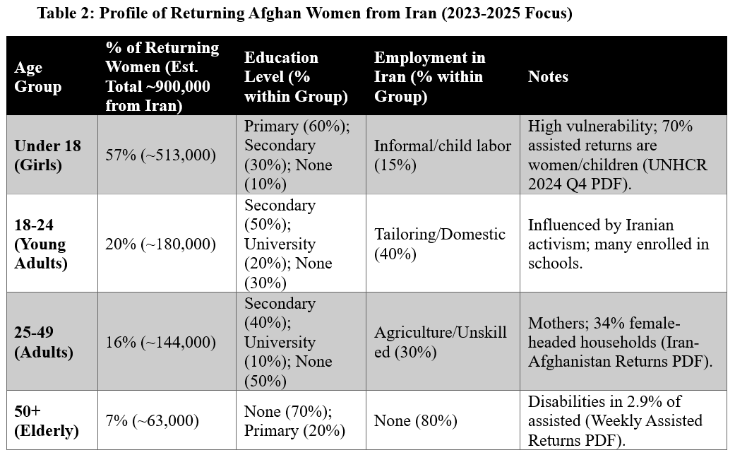 The data reveal a rapid, forced return in which women and children predominate among assisted groups. Roughly one-third of household heads report some formal schooling—often gained in Iran. This cohort, numbering hundreds of thousands of women from Iran alone since 2023, carries a different societal outlook into an environment largely at odds with that learning.