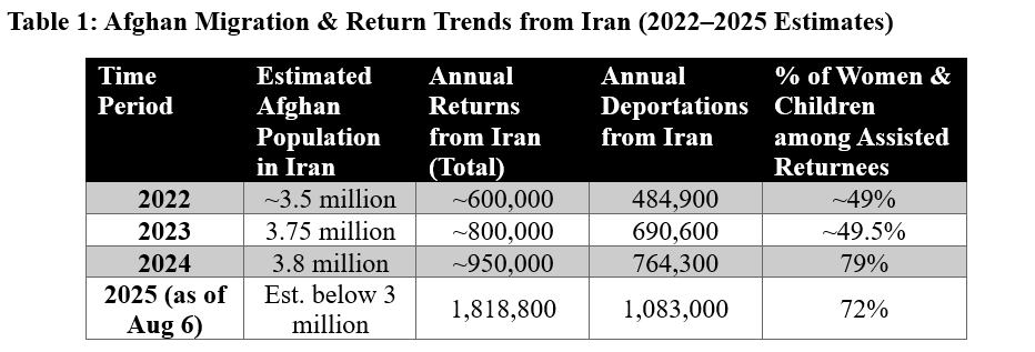 While a fully harmonized 10-year time series is not publicly available, recent figures from the UN Refugee Agency (UNHCR) show an alarming surge in returns, especially from Iran. From the start of 2025 to August 6, more than 2.1 million Afghans have returned from Iran and Pakistan. Iran’s share is striking: about 1.82 million returned from Iran, of whom about 1.08 million (60 percent) were deportations. This represents a dramatic escalation from previous years.